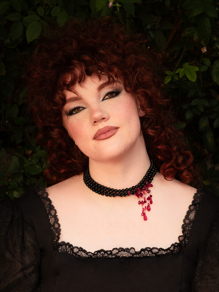 Embrace dark romance with this Multi-String Choker in black, adorned with striking red crystals that drip like blood. This sophisticated piece captures vampire-inspired allure, blending delicate white beads with dramatic crimson accents for a hauntingly elegant statement. Perfect for adding a touch of mysterious passion to your ensemble.