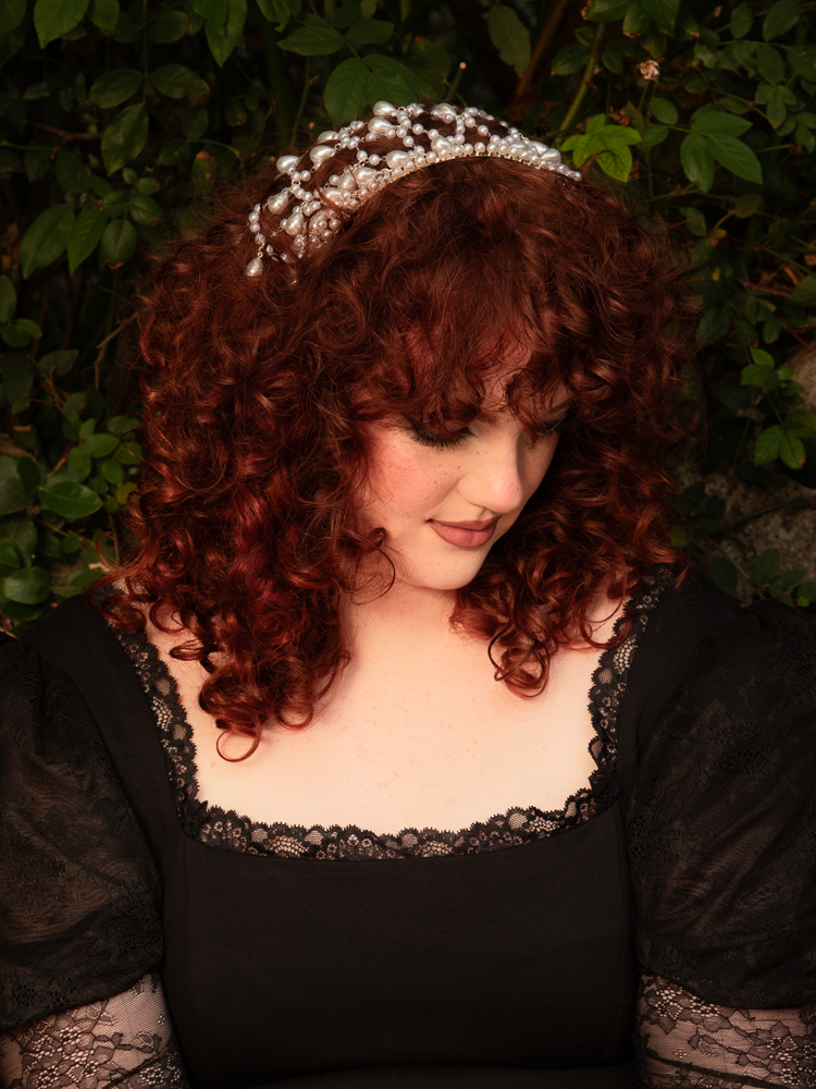 Elevate your look with this silver headband featuring delicate cascading pearl netting. Inspired by Renaissance elegance, it exudes romantic, princess-like charm, perfect for adding a refined touch to any ensemble.
