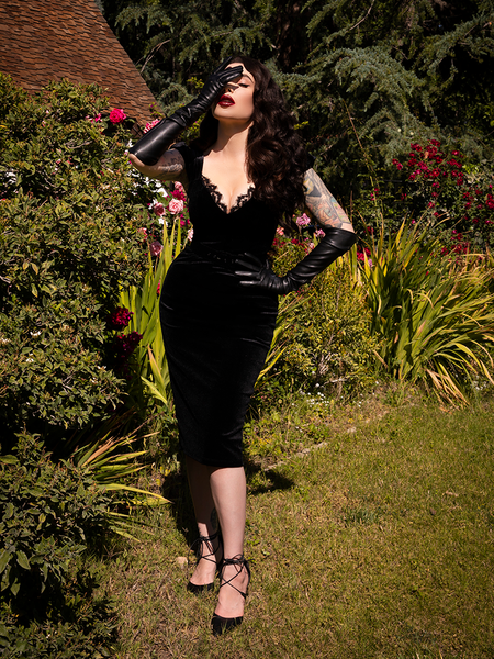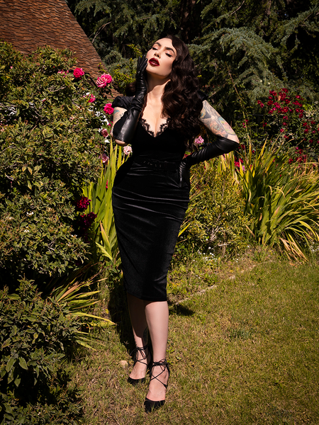 Inspired by the victorian gothic fashion of Penny Dreadful and 1950's film vamps, this wiggle dress is just as dangerous as those leading ladies. The fluttered cap sleeves balance the deep plunging neckline and tight pencil body. Made from high end stretch velvet with imported eyelash lace, the entire body is fully lined in ponte. This dress also features a matching 1.5 inch faux leather velvet covered belt, back zippered closure, and a clean back slit!