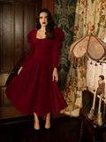 Indulge in opulence with our Victorian-inspired dress design. This exquisite velour ensemble boasts a dramatic yet comfortable fit. The deep portrait neckline features self-covered buttons, with the upper three buttons functional. The bodice's princess seams create a Victorian hourglass figure without sacrificing comfort and gives a touch of support with light boning at the sides. The full-shirred waist includes deep pockets for added functionality. The dress is finished with a concealed bridal zipper closure at the center back. Admire the statement-making leg o' mutton deep pleated sleeves.
