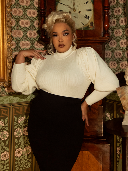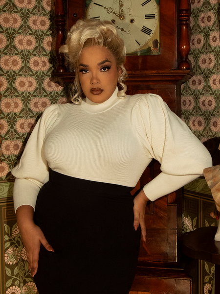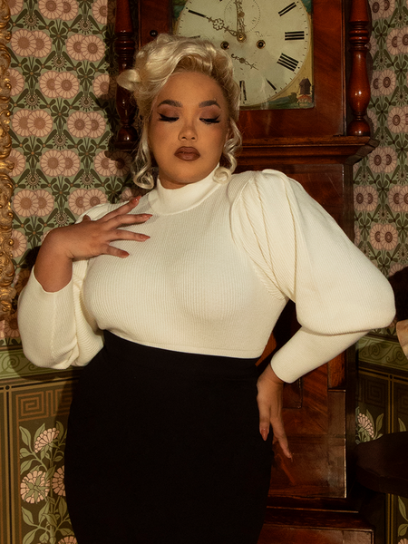 Embody elegance and luxury with our Victorian Cycling Pullover Sweater in ivory. Based on the original design featured in the Brooklyn Museum Costume Collection at The Metropolitan Museum of Art, this stunning sweater captures the essence of the 1890s. This bold pleated puff sleeve pullover is knitted in fully fashioned 7 gauge soft knit with classic half cardigan stitch at bodice and sleeves easing into a 1 x 1 knit rib at cuffs and waist to create a fitted hourglass silhouette. The neck style is a mock turtleneck. Its dramatic leg-of-mutton sleeves taper into fitted lower sleeves with rib knit.  Perfect for any historically inclined wardrobe, this sweater boasts a fancy, herringbone stitch hem for the ultimate touch of sophistication. Complete your premium look with this exquisite piece. For more drama we've added shoulder pads that are removable.